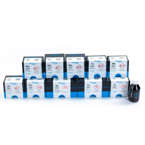 The package of reagents designed for taking measurements of basic parameters in marine water. Contains 10 sets of reagents and one bottle of deionized water.