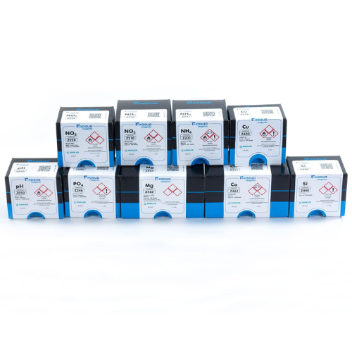 Alkalinity KH, Calcium Ca marine water, Copper Cu, Magnesium Mg marine water, Nitrate NO3 high range, Nitrate NO3 low range, Nitrite NO2 high range, Nitrite NO2 low range, pH 4.5-9.0, Phosphate PO4, Silicon Si, Total ammonia NH4 marine water |